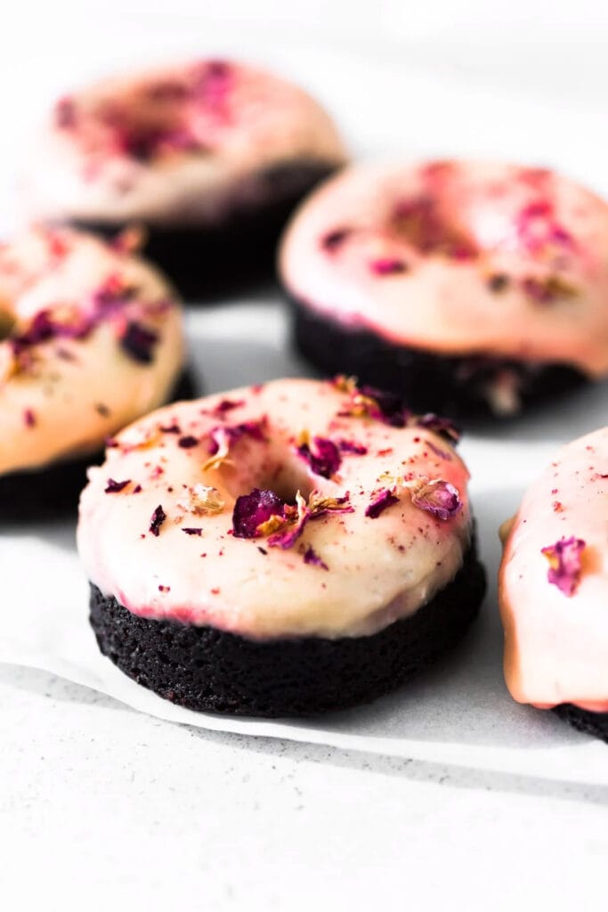 This wonderful chocolate vegan donut recipe features a deliciously sticky rose and sugar glaze! They’re easy to make, easy to customize and there’s no need for vats of hot oil – you can just bake them in the oven!